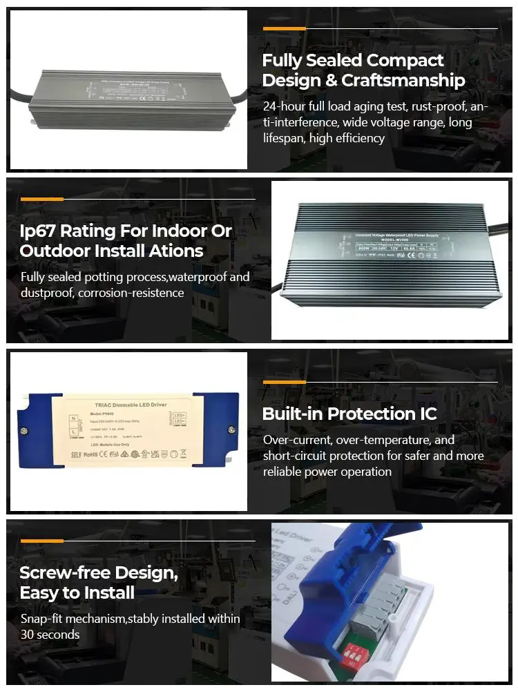 Nagy hatékonyság és energiatakarékosság · Erős sokoldalúság: Az áramátalakítási hatékonyság eléri a 92%-ot vagy még többet, készenléti energiafogyasztás <0,3 W, megfelel a nemzeti első osztályú energiahatékonysági szabványoknak; Széles feszültség bemeneti tartomány AC85-265V, kompatibilis a globális önkormányzati árammal; A karosszéria mérete 85×55×30 mm, három beépítési móddal, lakásfelújítással, kereskedelmi és mérnöki forgatókönyvekkel.