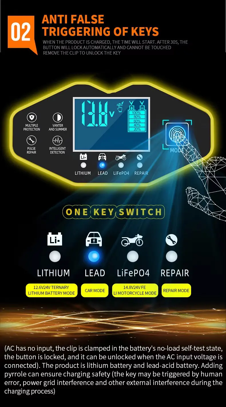 1. Intelligens és kompatibilis A ZYX-J40 a piacon szinte minden típusú akkumulátort támogat, beleértve az ólom-savas, AGM, Gel, EFB, Li-ion és LiFePO₄ (lítium-vas-foszfát) akkumulátorokat. Széles, 2Ah-tól 150Ah-ig terjedő kapacitástartományával a kis motorkerékpár-akkumulátoroktól a nagy autóakkumulátorokig mindent kezel.