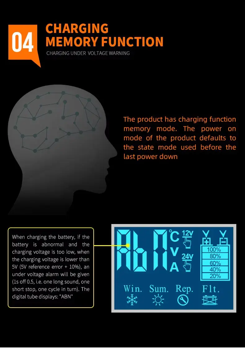 2. Optimalizált töltési teljesítmény Ez a töltő 12V-ot 6A-nél és 24V-ot 3A-nél biztosít, maximális teljesítménye 110W és 85%-os töltési hatékonysága teljes terhelés mellett. Az automatikus 7-fokozatú intelligens töltési program magában foglalja a szulfátmentesítést, a lágyindítást, a tömeges töltést, az abszorpciót, az elemzést, a kondicionálást és az úszókarbantartást. A dedikált téli üzemmód biztosítja a biztonságos töltést hidegben is, az LCD-kijelző pedig lehetővé teszi a töltési feszültség, az áram és az akkumulátor hőmérsékletének valós időben történő nyomon követését.