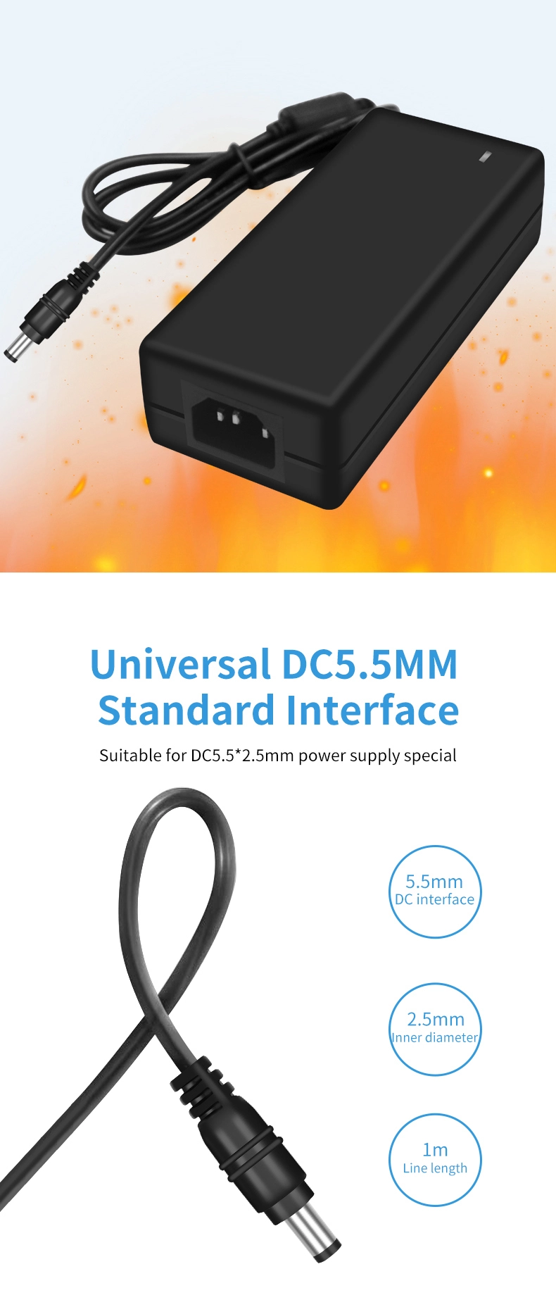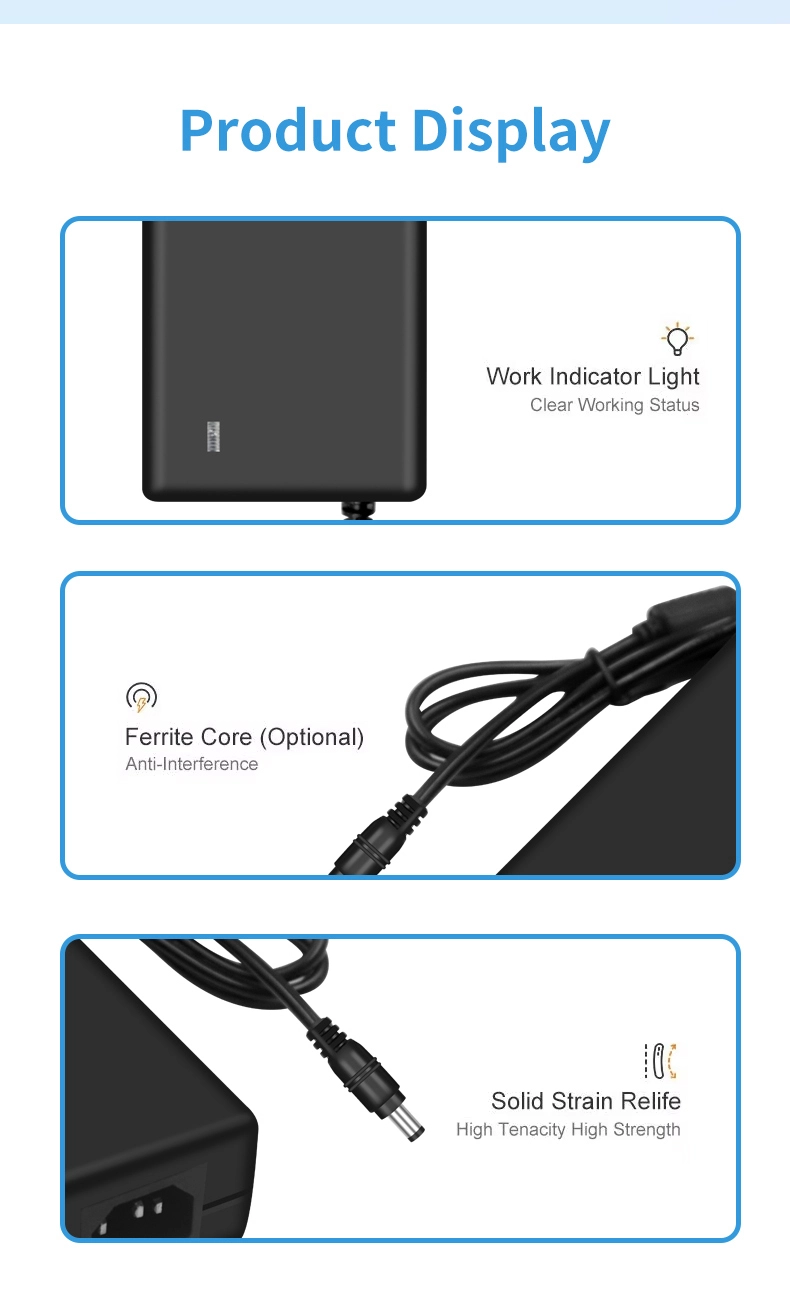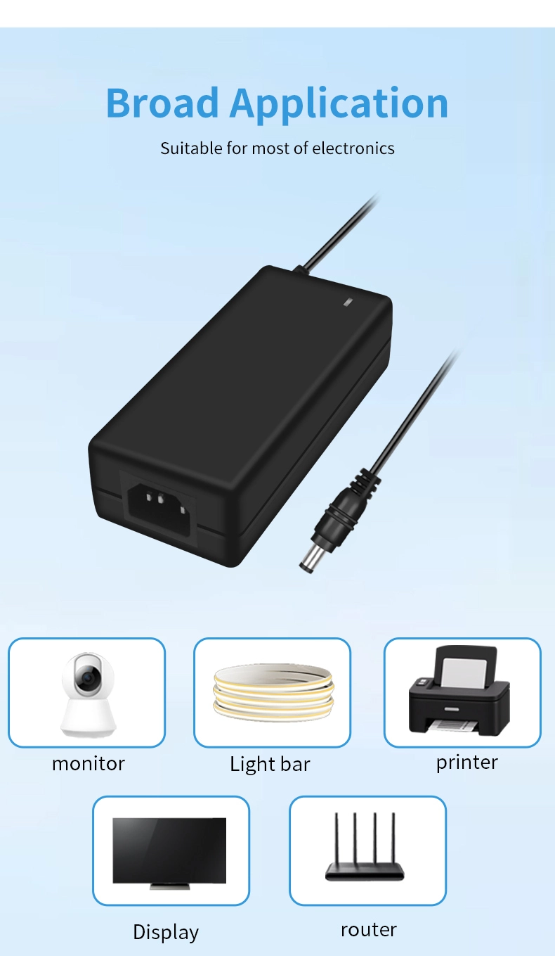 Az AC 100-240 V széles feszültségű bemenet világszerte több mint 100 ország elektromos hálózatával kompatibilis. Az 1,5 m-es meghosszabbított kimeneti kábel (1,0 mm² átmérő) 180°-ban elforgatható egyenáramú csatlakozóval párosítva különféle telepítési helyzetekhez igazodik. Kompakt, mindössze 120 × 60 × 30 mm-es méretével 35%-kal kisebb, mint a hagyományos, azonos teljesítményű adapterek, súlya mindössze 280 gramm, ami 50%-kal javítja a hordozhatóságot.