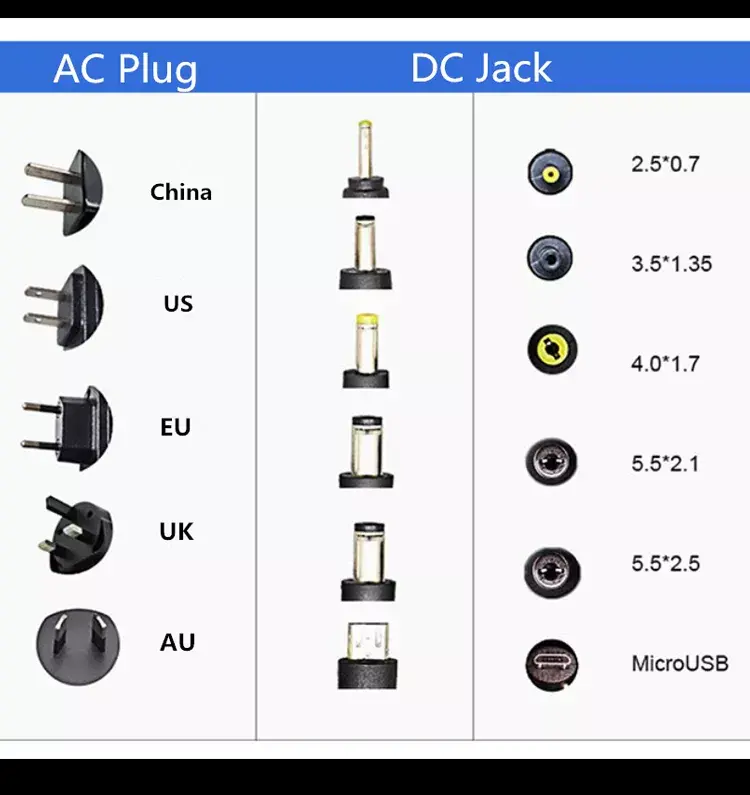 Csatlakozó típusa: Szabványos egyenáramú hengeres csatlakozó (általános méretek 5,5 mm × 2,1 mm vagy 5,5 mm × 2,5 mm, testreszabható az eszköz követelményei szerint).