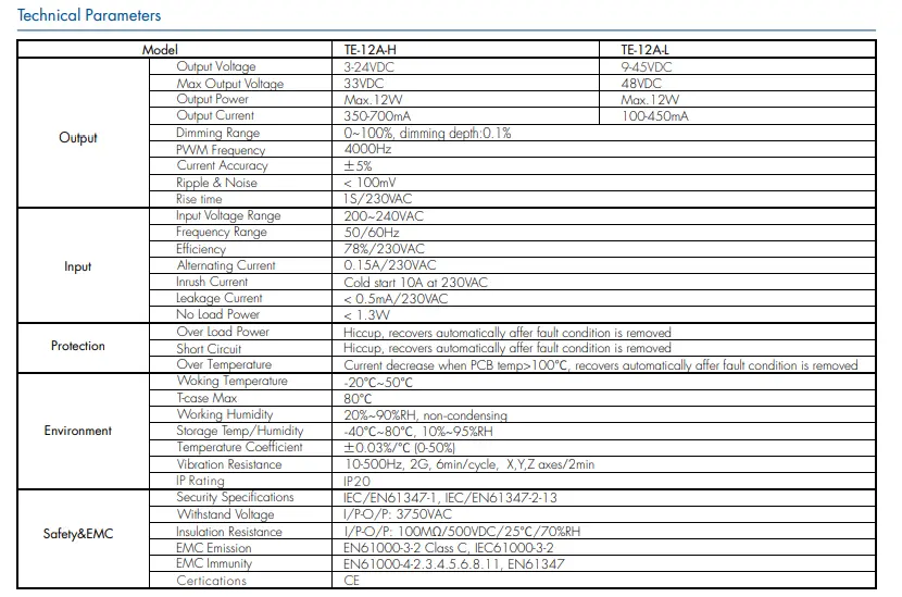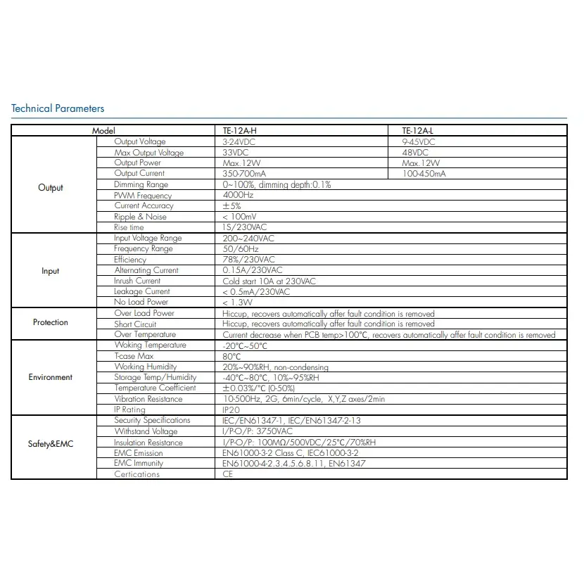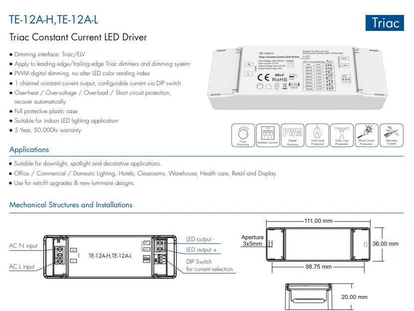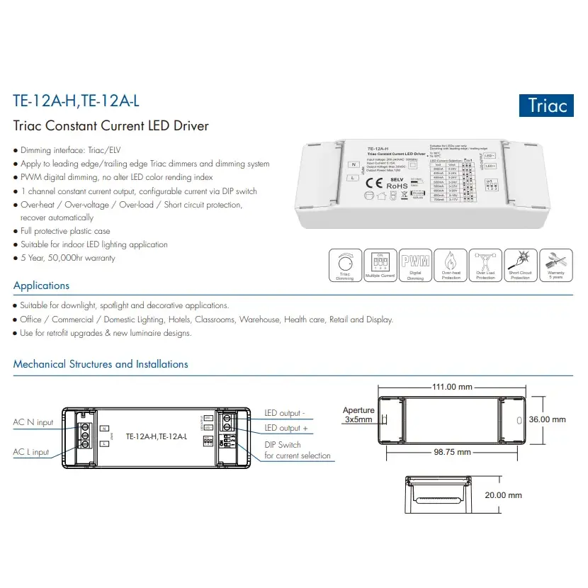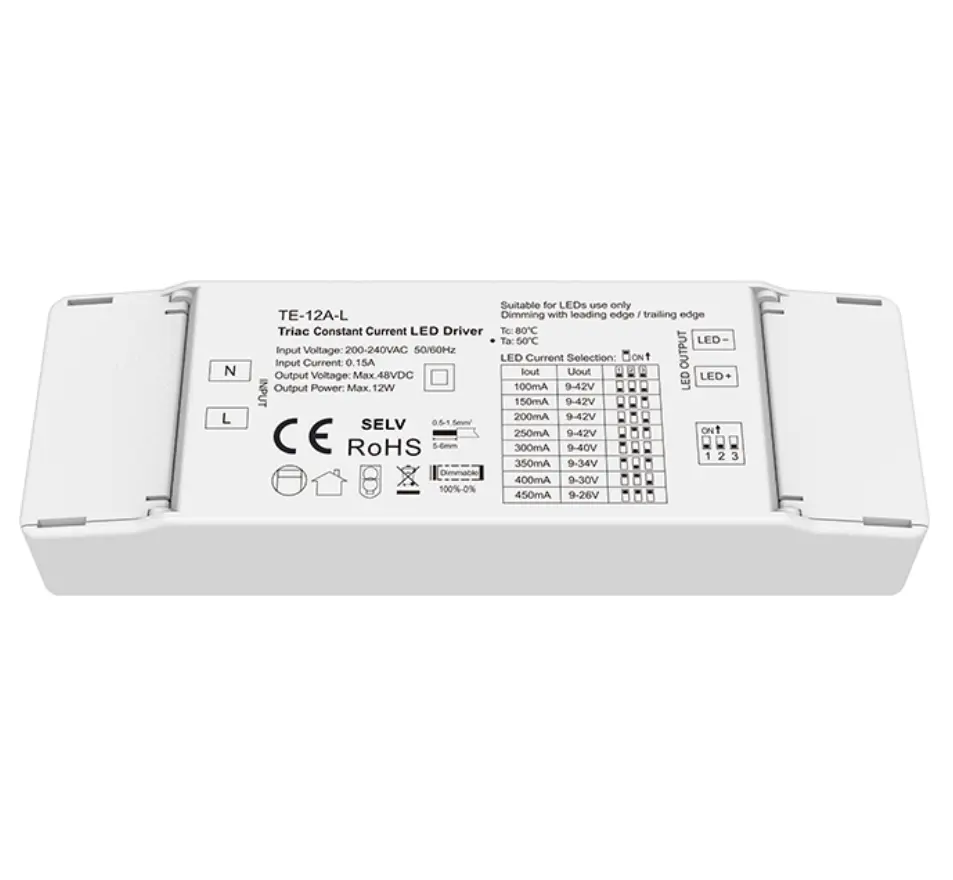 A Starwell kiváló minőségű, 12 W-os, állandó áramú, triac fényerőszabályzó led-meghajtója túlfeszültség-, túláram- és rövidzárlatvédelmi funkciókat tartalmaz, valamint magas teljesítménytényezővel és alacsony harmonikus torzítással rendelkezik, megfelelve számos nemzetközi energiahatékonysági és biztonsági szabványnak. Kompakt kialakítása megkönnyíti a telepítést, és alkalmas különféle beltéri világítási forgatókönyvekhez, például mélysugárzókhoz, spotlámpákhoz és díszlámpákhoz, így ideális meghajtó megoldás energiatakarékos felújításokhoz és intelligens világítási alkalmazásokhoz. TermékJellemzők: