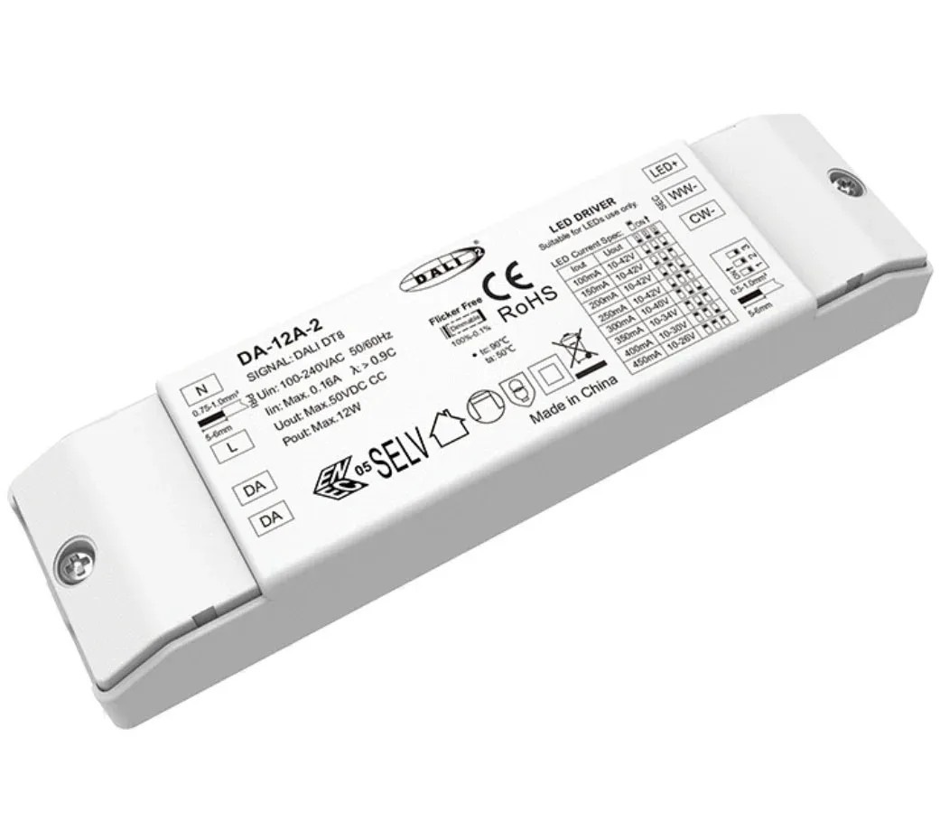 A STARWELL gyár kiváló minőségű, 12 W-os DALI CW WW CCT szabályozható LED meghajtóját prémium minőségű, hangolható fehér világítási alkalmazásokhoz tervezték, amelyek precíz vezérlést és megbízható teljesítményt igényelnek. Ez a kompakt, nagy hatásfokú meghajtó stabil, 12 W-os (12 V, 1000 mA) állandó áramkimenetet biztosít, optimális teljesítményt és hosszú élettartamot biztosítva a csatlakoztatott LED-modulok számára. Kiváló minőségű, 12 W-os DALI CW WW CCT dimmelhető LED-illesztőprogramunk kifinomult kettős DALI interfésszel rendelkezik, amely támogatja a DALI-2 fényerő-szabályozást (DT8) a zökkenőmentes 10%-100%-os sima fényerő-szabályozás érdekében, valamint a független CCT (korrelált színhőmérséklet) hangolást 2700K meleg fehértől 6500K hideg nappali fényig. Lenyűgöző, több mint 90%-os tipikus hatásfokkal és magas teljesítménytényezőjével (PF>0,9) minimálisra csökkenti az energiapazarlást és a hálózati terhelést. Kompakt, IP20-as besorolású tokban található, teljes terhelésű működést biztosít széles hőmérsékleti tartományban, -20°C és +50°C között, így sokoldalú és intelligens energiamegoldás az építészeti, kereskedelmi és csúcskategóriás lakossági világításhoz.