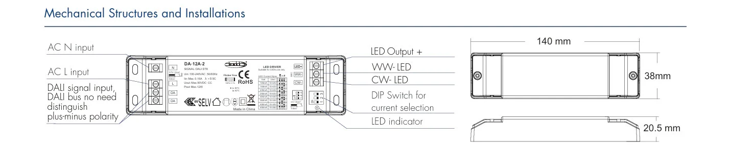 A kompakt IP20-as tokban található, szabályozható LED-meghajtóval még szűk helyeken is leegyszerűsödik a telepítés, mint például a LED-profilok vagy a lámpatestházak. Az állandó áramkimenet, a széles körű CCT hangolás és az ipari szabvány DALI-2 kompatibilitás kombinálásával ideális és jövőbiztos meghajtóként szolgál a hangolható fehér mélysugárzókhoz, lineáris lámpatestekhez és építészeti világításhoz – sokoldalú, állandó áramú LED DALI CCT Differm vezérlőként zökkenőmentesen integrálható a modern intelligens világítási ökoszisztémákba.