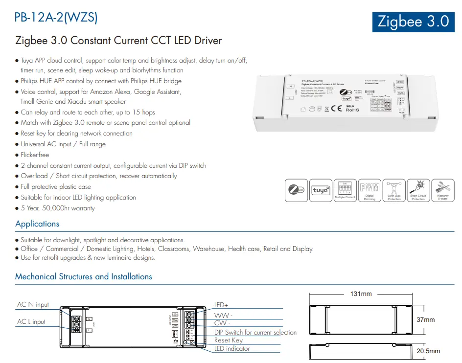 A max.12W LED terhelésre tervezett Zigbee 3.0 LED Driver teljes körű biztonsági védelmi funkciókat biztosít. A stabil kimenet és a megbízható vezeték nélküli kommunikáció ideálissá teszi a különféle, hosszú távú stabilitású beltéri intelligens világítási projektekhez.