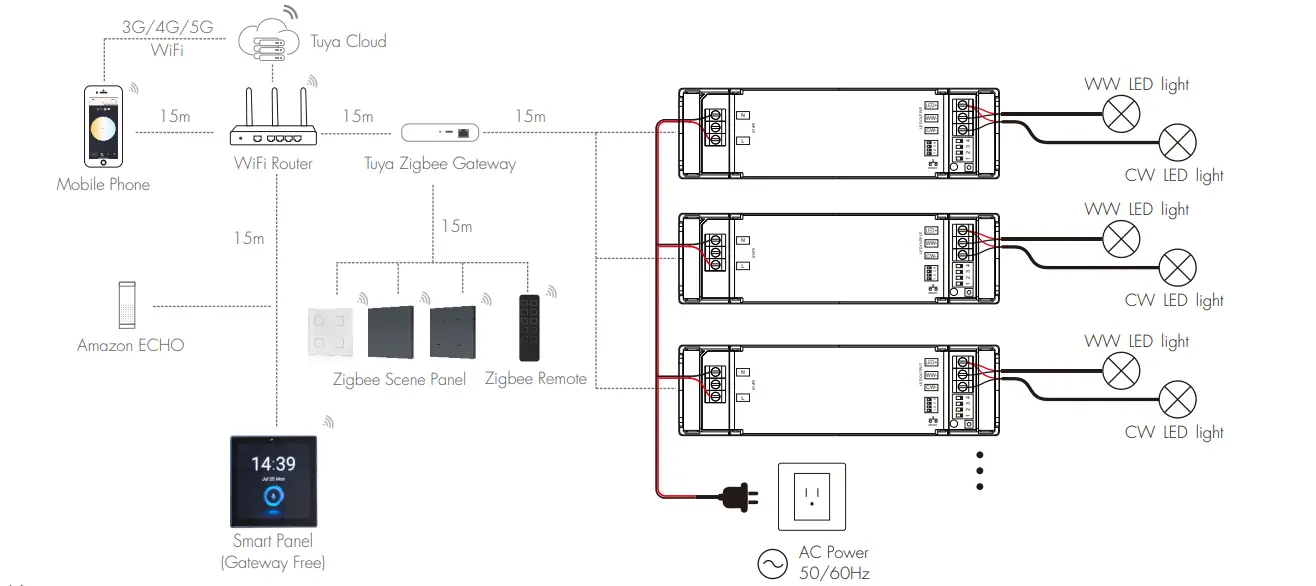 A TUYA Zigbee LED-illesztőprogram teljes mértékben támogatja a TUYA Zigbee protokollt a stabil vezeték nélküli kapcsolat érdekében, amely egyenletes, villogásmentes CCT-t és fényerő-tompítást tesz lehetővé. Támogatja az APP vezérlést, a hangvezérlést, a csoportvezérlést és a jelenet módot, ami nagyszerű kényelmet biztosít az intelligens világítási rendszerek számára.