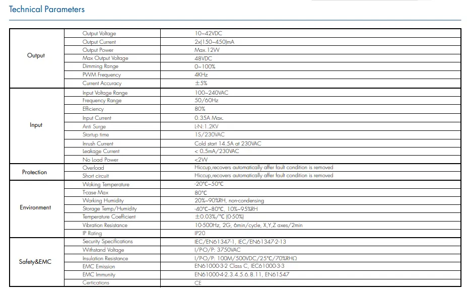 A 100–240 VAC univerzális bemenettel rendelkező, szabályozható CCT LED-illesztőprogram alkalmazkodik a globális áramhálózatokhoz. Magas, akár 85%-os hatásfok és ≥0,90 teljesítménytényező alacsonyabb energiafogyasztás és hőtermelés, meghosszabbítva a meghajtó és a LED élettartamát.