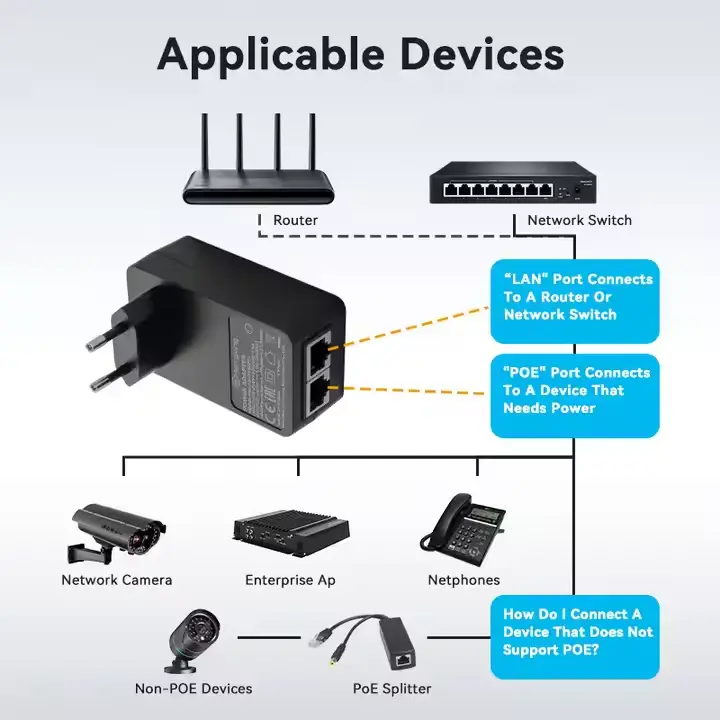 A 12 W-os falra szerelhető, cserélhető dugós PoE befecskendező egy integrált hálózati tápegység, amely egyetlen kompakt egységben egyesíti a hálózati adaptert és a passzív PoE befecskendezőt. Ellentétben a hagyományos PoE-beállításokkal, amelyek tápadaptert és injektormodult is igényelnek, ez a kialakítás leegyszerűsíti a telepítést, mivel lehetővé teszi az eszköz közvetlen fali aljzatra szerelését.