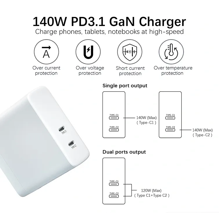 GAN: A GaN chipekkel a 140 W-os PD Charger mérete 50%-kal kisebb a hagyományos töltőkhöz képest, így könnyen hordozható üzleti utakra vagy irodai használatra anélkül, hogy helyet foglalna a konnektorban.