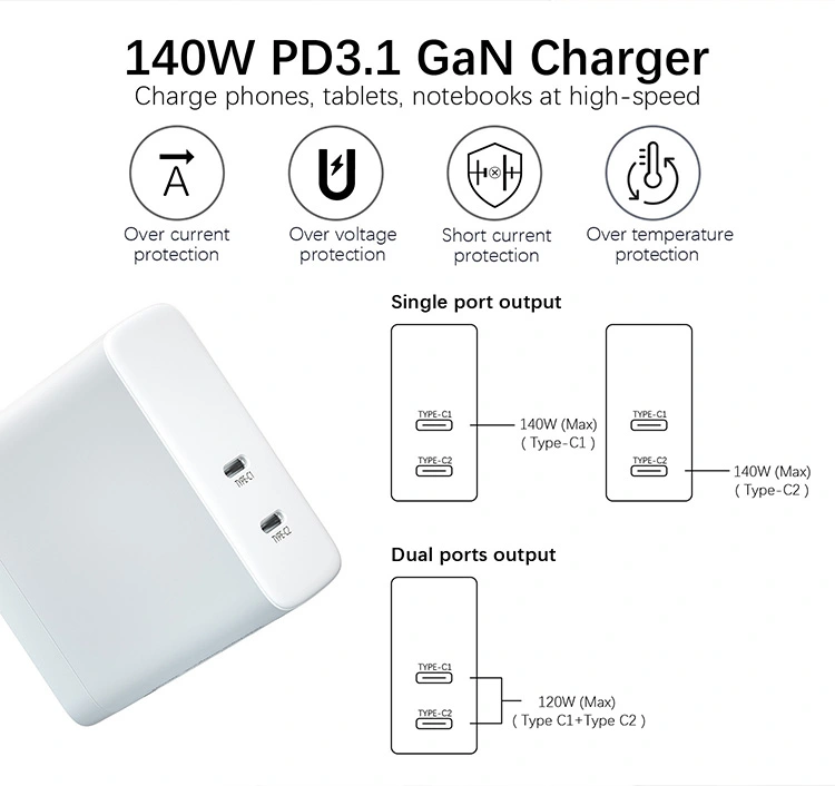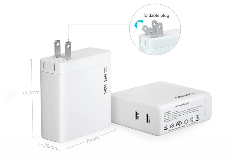 140 W-os dupla usb c port PD töltő US-csatlakozó összecsukható: Az egyetlen port akár 140 W teljesítményt biztosít. A kétportos kimeneti teljesítmény intelligens módon, egyidejűleg allokálódik. Laptop és mobiltelefon egyidejű töltésekor a hatásfok változatlan marad.