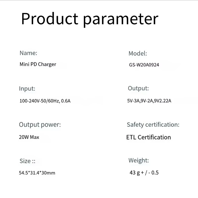20 W japán verziójú csatlakozó PD töltő Műszaki adatok: