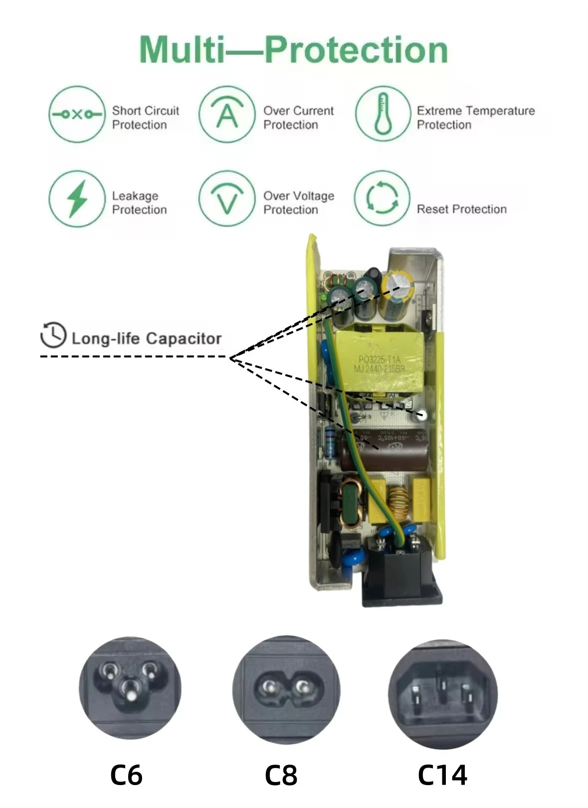 Átfogó biztonsági védelem: Az integrált biztosítékok, köztük a túláramvédelem (OCP), a túlfeszültség elleni védelem (OVP) és a rövidzárlat elleni védelem (SCP) megakadályozzák az adapter és az értékes berendezés károsodását.