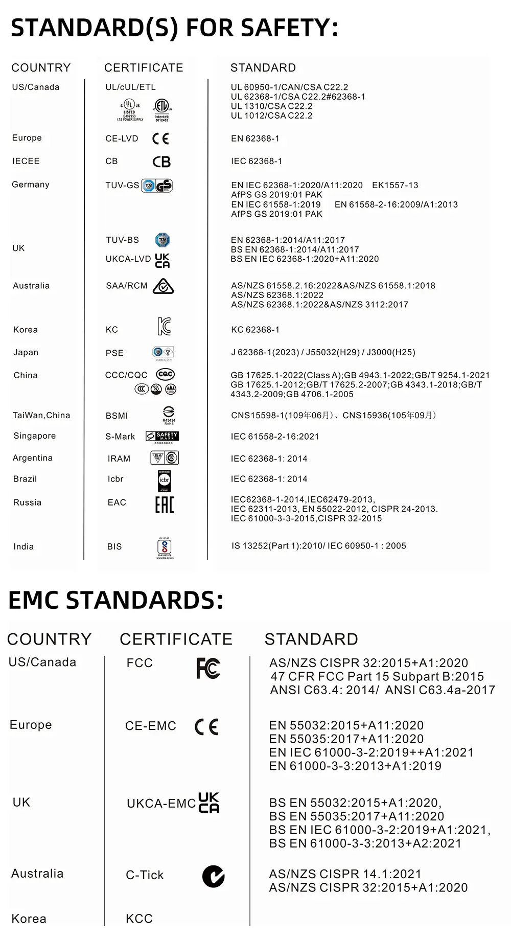 Az Ön biztonsága a legfontosabb. Ezt az adaptert úgy tervezték és gyártották, hogy megfeleljen a szigorú nemzetközi szabványoknak, így nemcsak a megbízható teljesítményt, hanem a nyugalmat is biztosítja. Megfelel az ETL CE FCC TUV GS CB PSE KC KCC BIS SAA RCM c-Tick CCC UKCA UL cUL RoHS előírásainak, amelyek szabályozzák a biztonságot, az egészséget és a környezetvédelmet.