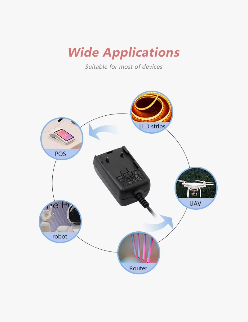 Alkalmazási forgatókönyvek széles skálája: Legyen szó LED-es fénycsíkokról, intelligens hangszórókról, hálózati útválasztókról vagy más kis elektromos készülékekről, ez a nagy teljesítményű, cserélhető, cserélhető tápegység a legideálisabb és legmegnyugtatóbb választás!