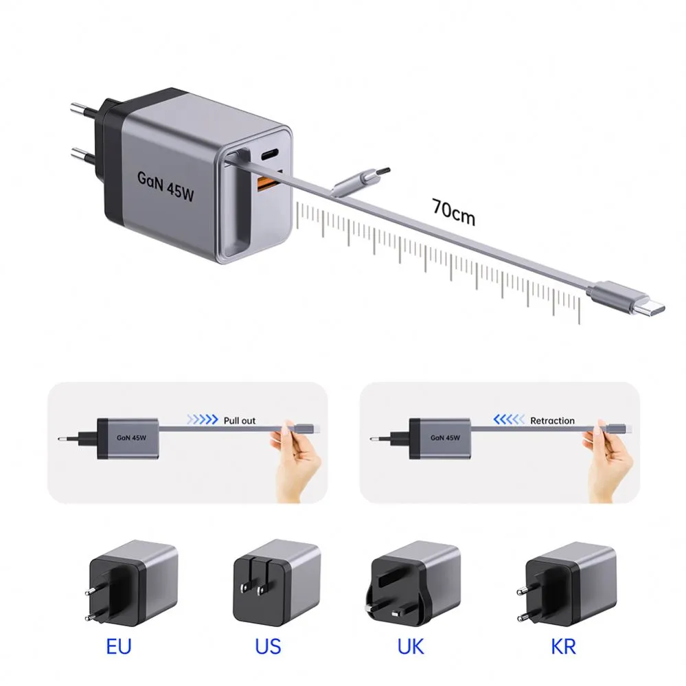 45 W EU AC csatlakozó PD töltő visszahúzható c típusú kábellel |