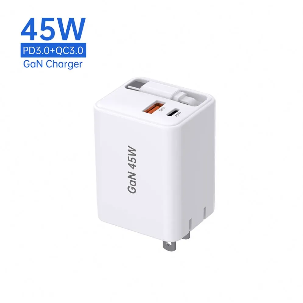 GAN 45W visszahúzható gyorstöltő USB-KÁBEL+USB-A+USB-C 45W PD töltő kábellel