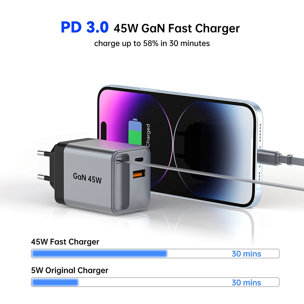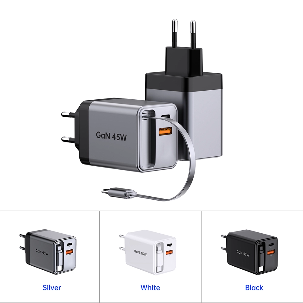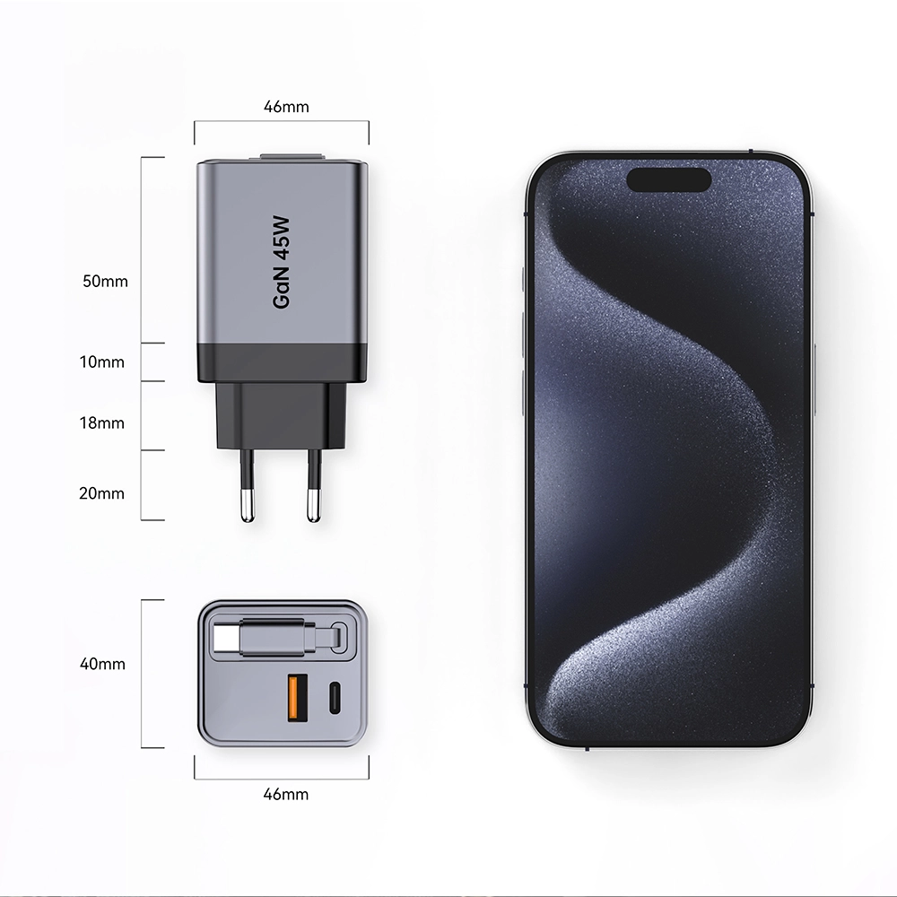 Nagy sebességű töltés: A 45 W-os GAN visszahúzható gyorstöltő 45 watt teljesítményű, gyors töltést biztosít eszközei számára.