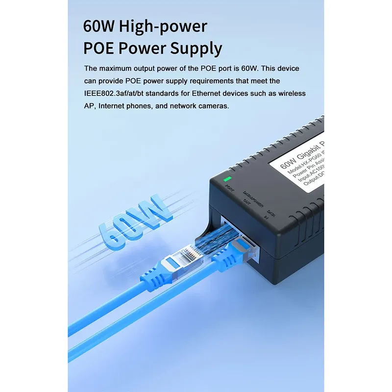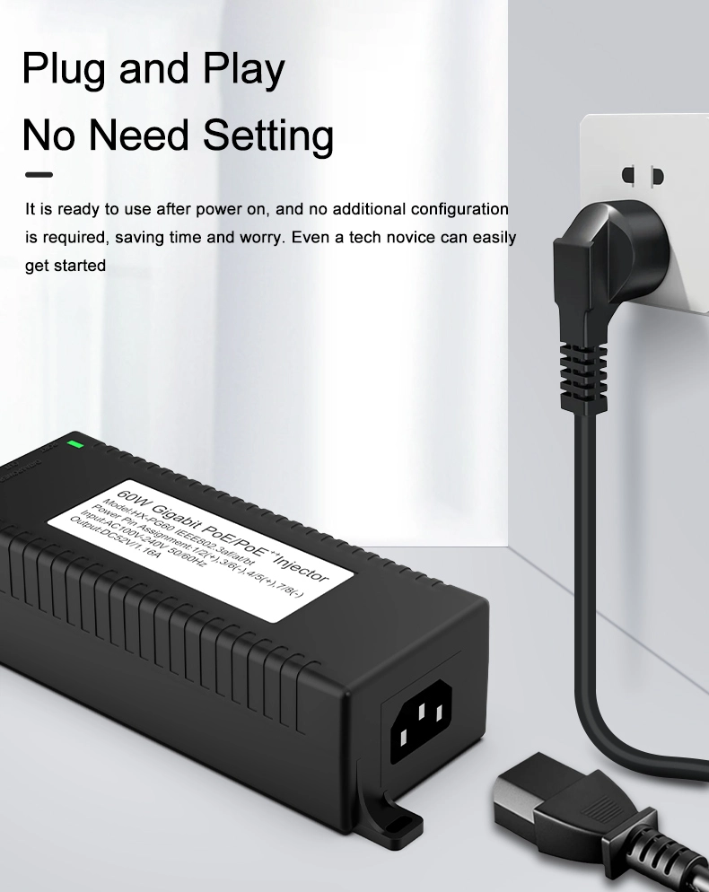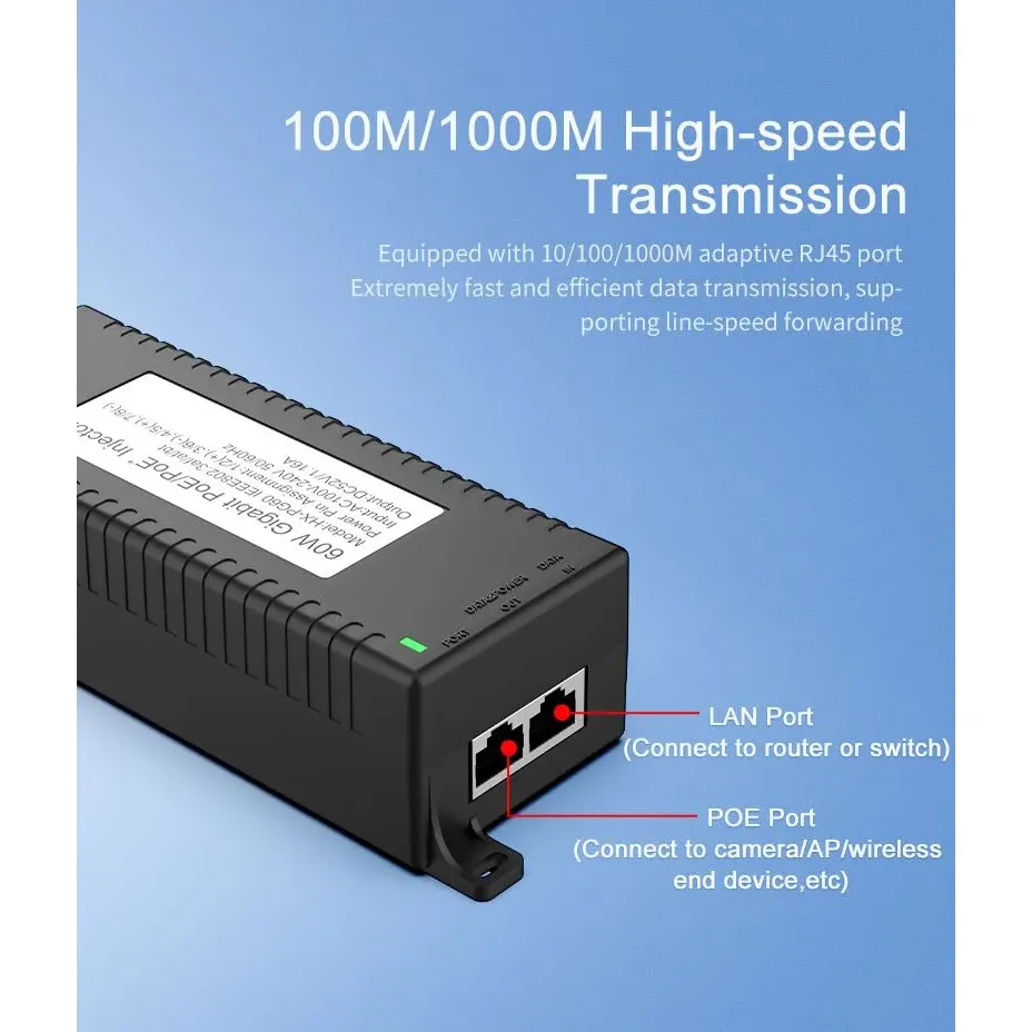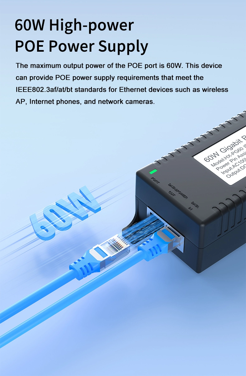 Biztonsági felügyelet: A gigabites 60 W-os asztali POE befecskendező az IP-kamerák biztonsági és hálózati eszközei számára stabil áramellátást biztosít az IP-kamerák és a PTZ-kamerák számára.