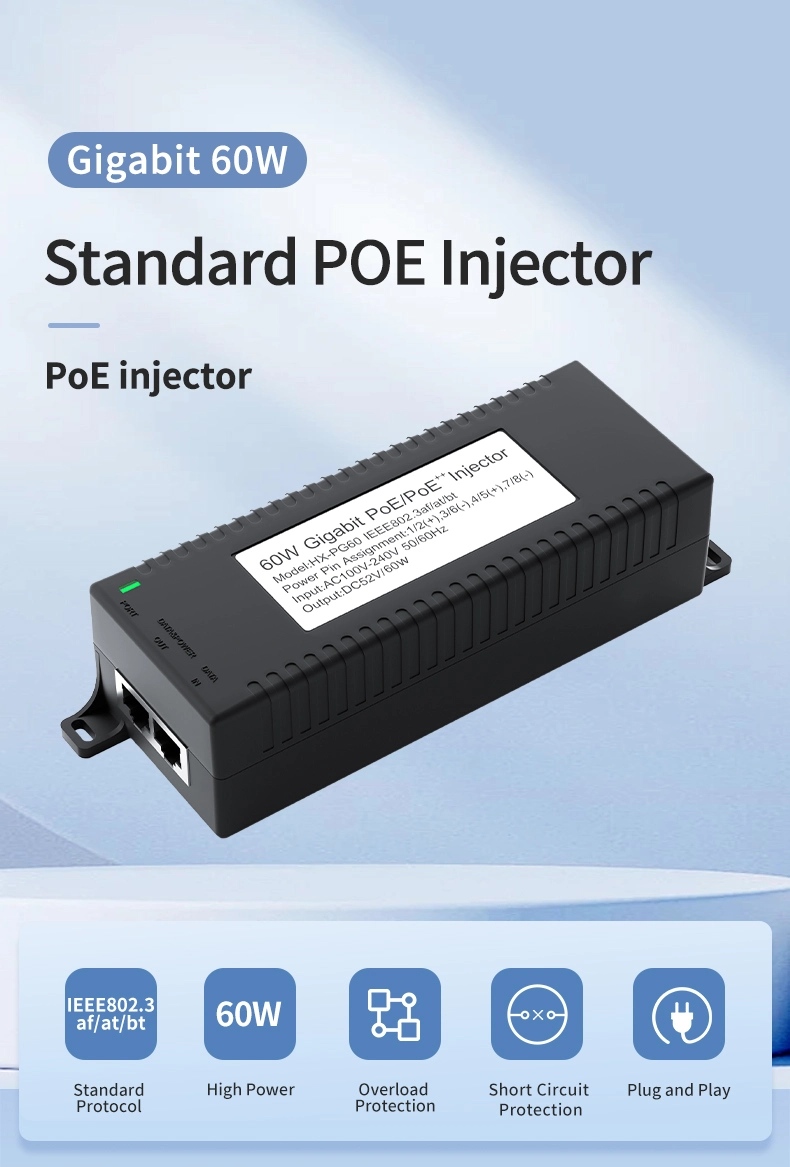 Vásároljon minőségi 60 W-os asztali POE befecskendezőt IEEE802.3AF/AT/BT-vel a Starwelltől, egy professzionális kínai PoE befecskendező gyártótól. Szigorúan betartja az IEEE 802.3af/at/bt nemzetközi szabványokat, és úgy tervezték, hogy egyidejűleg áramot és adatokat továbbítson Ethernet-kábeleken keresztül a hálózati eszközök számára. Támogatja a 60 W-os kimeneti teljesítményt, és tökéletesen fogadja és hajtja meg a nagy teljesítményű PoE-kompatibilis eszközöket, például PTZ dómkamerák, nagyfelbontású kamerák, vezeték nélküli hozzáférési pontok és videotelefonok. Az injektor kompakt asztali kialakítású, és közvetlen tápcsatlakozóval rendelkezik a plug-and-play kényelem érdekében, további konfiguráció nélkül. Intelligens áramkör-védelmi mechanizmussal van felszerelve, amely hatékonyan akadályozza meg a túláramot, a túlfeszültséget és a rövidzárlatokat, biztosítva a végberendezések stabil és biztonságos tápellátását különféle telepítési környezetekben.