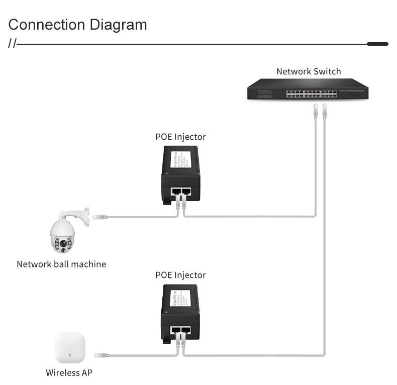 Rugalmas alkalmazás: 60 W-os Gigabit Active PoE Splitter IEEE802.3af 1000 Mbps sebességű IP-kamerához A vezeték nélküli hozzáférési pont párosítható egy Gigabit PoE Splitterrel, hogy nem szabványos eszközöket biztosítson áramellátáshoz, ezáltal bővítve az alkalmazási forgatókönyvek körét.