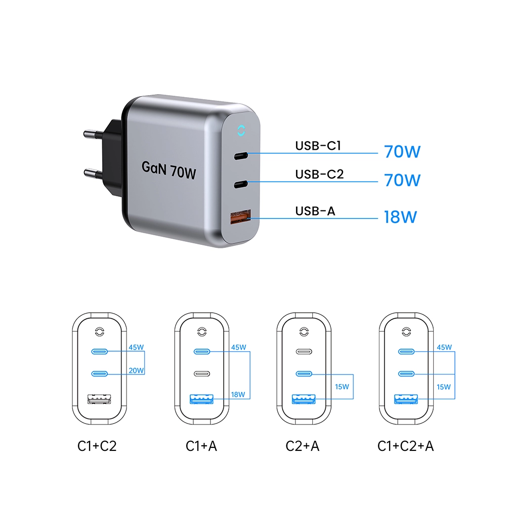 C1/C2 kimenet: 5V3A,9V3A,12V3A,15V3A,20.6V3.4A (max. 70W) PPS: 3.3-11V 4.05A USB-A kimenet: 5V3A, 9V2A, 12V1.5A 3.3-11V 2A (max. 22W) C1+C2 Kimenet: 45W+20W C1+C2+USB-A Kimenet: 45W+5V3A Összesen: 70W |