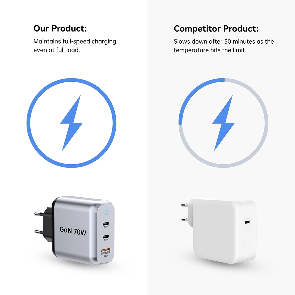 Starwell tartós, 70 W-os PD gyorstöltő latpop táblagépekhez, más néven 70 W GaN gyorstöltő: 2C1A, amely kielégíti a mobiltelefonok és táblagépek napi gyorstöltési igényét. Kis méretű, erős teljesítményű, fejlett gallium-nitrid technológiával. Egyetlen portban használva az USB-C1 interfész maximális kimeneti teljesítménye 70 W. Ha a két portot együtt használják, az USB-C1 továbbra is fenntartja a 45 W-os PD gyorstöltést. Több gyorstöltési protokollt támogat, beleértve a PD3.0, PPS, QC4+ és QC3.0 protokollokat, így széleskörű kompatibilitást biztosít a különböző eszközökkel