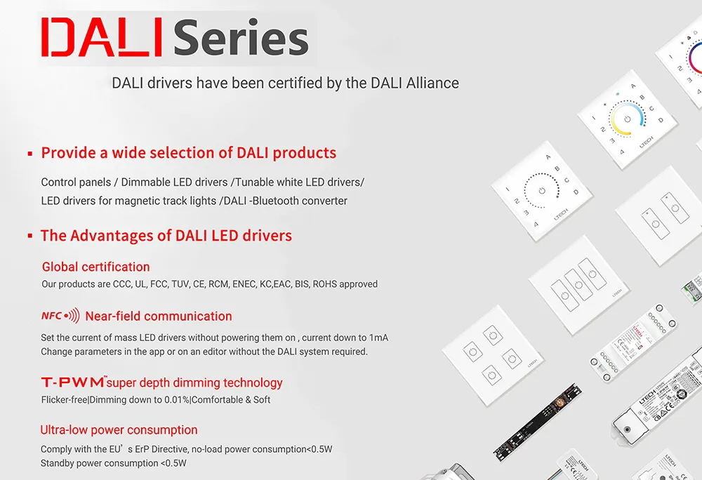 Fejlett DALI fényerőszabályozás – Lehetővé teszi a 0,1%-tól 100%-ig terjedő digitális fényerő-szabályozást nagy felbontással, akár 64 DALI-cím támogatásával az automatizált világítási rendszerek egyéni vagy csoportos vezérléséhez.