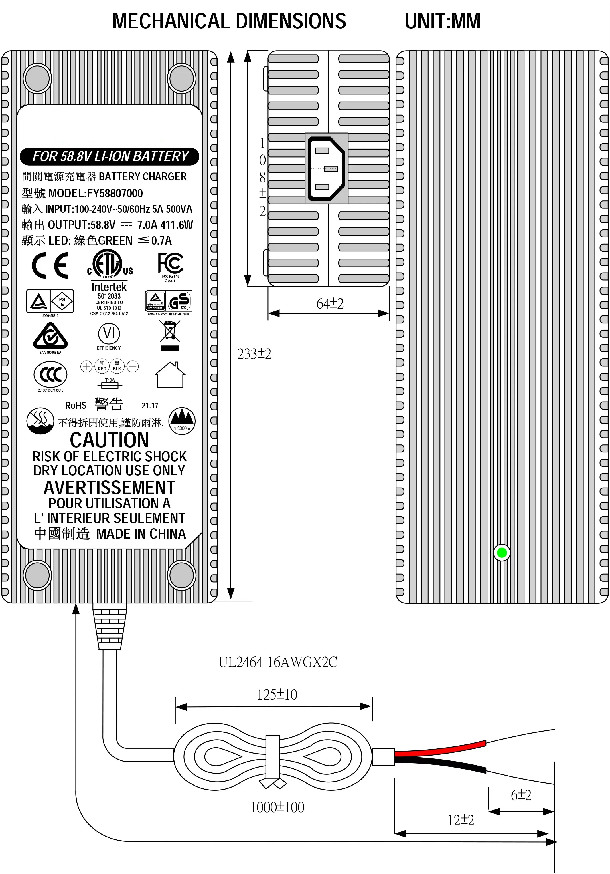 Az UL, ETL, CUL, GS, CE, BS, SAA, KC, PSE, CB, FCC, EMC, RoHS, REACH szabványok szerint tanúsított töltő hatékony, gyors és biztonságos energiát biztosít az igényes elektromos mobilitási alkalmazásokhoz.