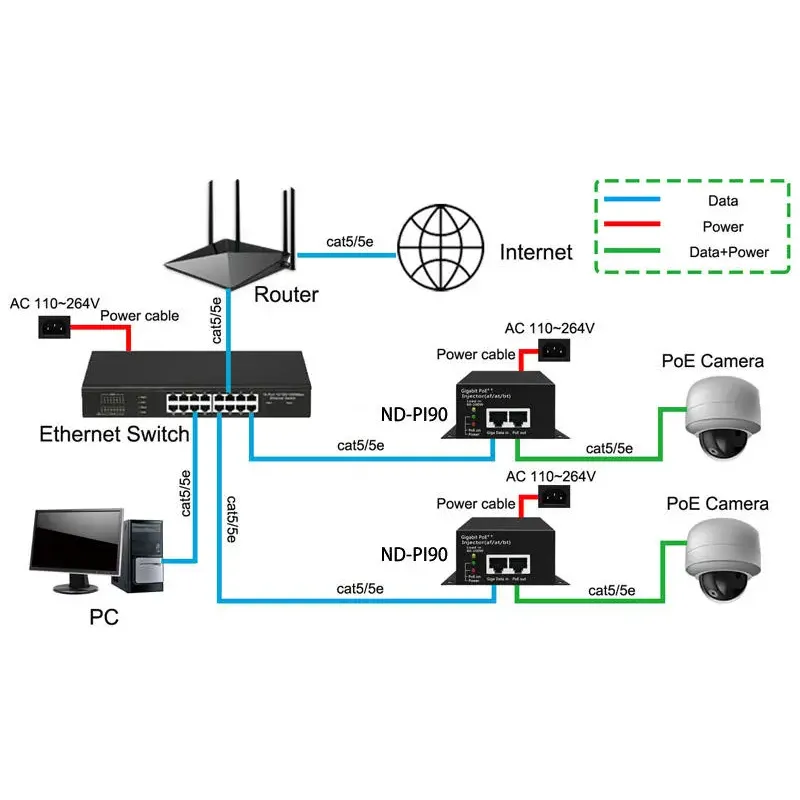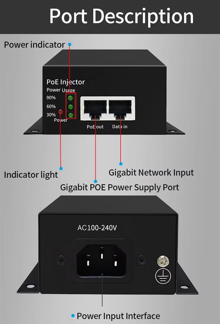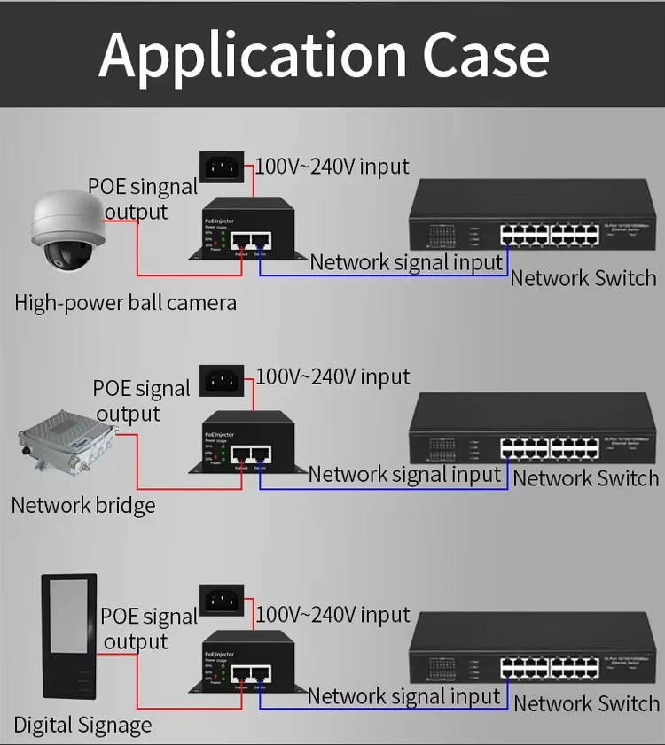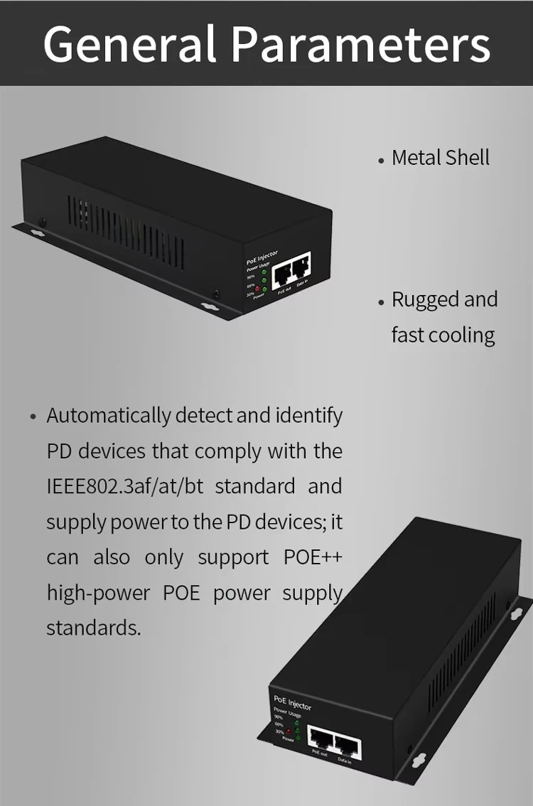 Ez a sokoldalúságra tervezett injektor visszafelé kompatibilis a 802.3af/at eszközökkel. Ideális PTZ kamerák, nagy teljesítményű vezeték nélküli hozzáférési pontok és videokonferencia berendezések táplálására. A termék egyszerű plug-and-play megoldást kínál, így nincs szükség további elektromos aljzatokra, és csökkenti a telepítés bonyolultságát a vállalati és ipari alkalmazásokban.