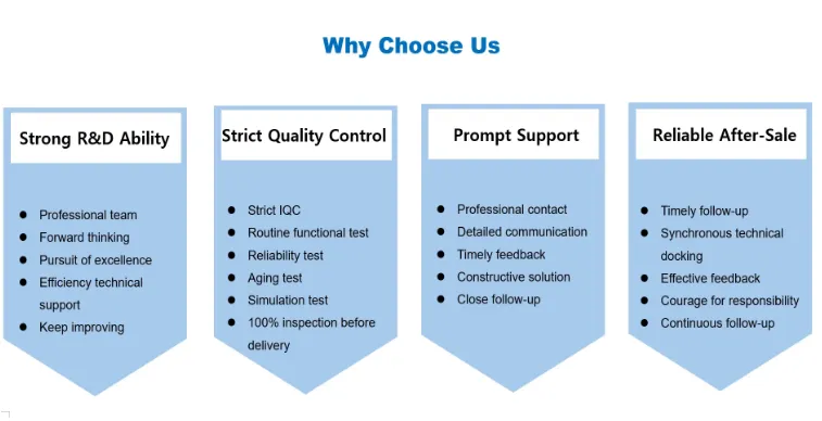Termékeink szigorúan megfelelnek a nemzetközi szabványoknak és a magas ipari szabványoknak a tervezéstől a próbavizsgálaton át a tömeggyártásig, és megfelelnek az olyan nemzetközi szabványoknak, mint a CE, FCC, RoHS, ETL stb., hogy biztosítsák a kompatibilitást és a megfelelőséget a globális piacon.