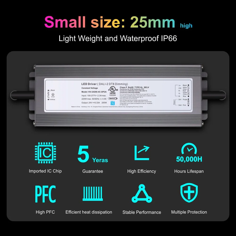 Az ígéretünk minősége és nyugalma minden részletben tükröződik. A termék UL tanúsítvánnyal rendelkezik, amely megfelel a szigorú nemzetközi biztonsági előírásoknak, és 5 év minőségbiztosítási garanciával rendelkezik. Dióhéjban ez nem csak egy tápegység; ez a világításvezérlés erőteljes, megbízható és rugalmas szíve. Ha ezt az eredeti DALI 2 DT8 szabályozható, 200 W-os LED-illesztőprogramot választja, professzionális minőségű intelligens világítási megoldást választ, amely jövőorientált.