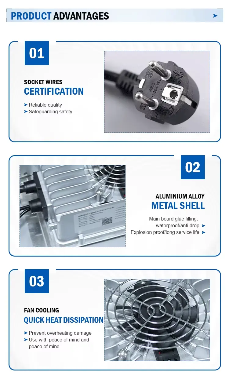 Nagy hatékonyság és intelligens védelem: Ez a töltő akár 93%-os hatásfokkal és ≥0,98 teljesítménytényezővel minimálisra csökkenti az energiaveszteséget és csökkenti a működési költségeket. A beépített védelmek közé tartozik a túlfeszültség, a rövidzárlat, a fordított polaritás és a túlmelegedés elleni védelem. A LED jelzőfény egy pillantással egyértelmű töltési állapotot mutat.
