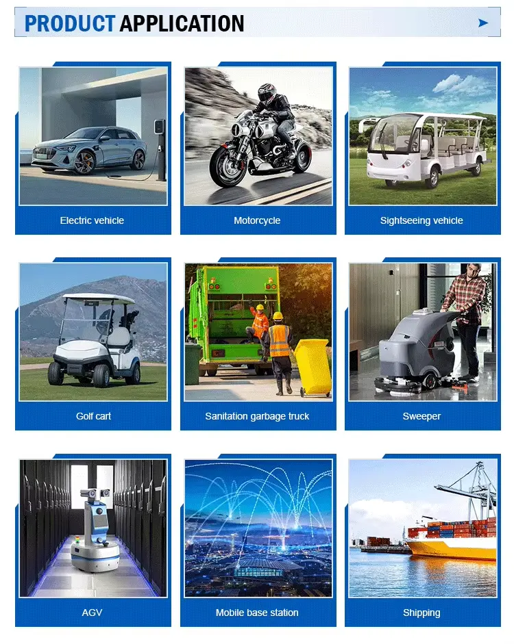 Használat: Motorkerékpár/Robogó, Háromkerekű, Takarítógép, Seprőgép, Targonca, Teherautó, Elektromos busz, Ólom-akkumulátor, Elektromos jármű, Városnéző jármű, Logisztikai jármű, Takarító jármű, Járőrautó, Dűne babakocsi, Hajó, Kommunikációs berendezések