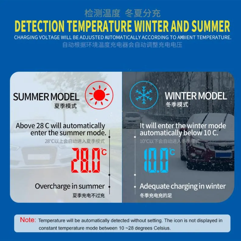 · 3 fokozatú intelligens töltés: Állandó áram → állandó feszültség → úszótöltés, automatikusan az akkumulátor állapotához igazítja a kimenetet a túltöltés megelőzése és az akkumulátor élettartamának meghosszabbítása érdekében.