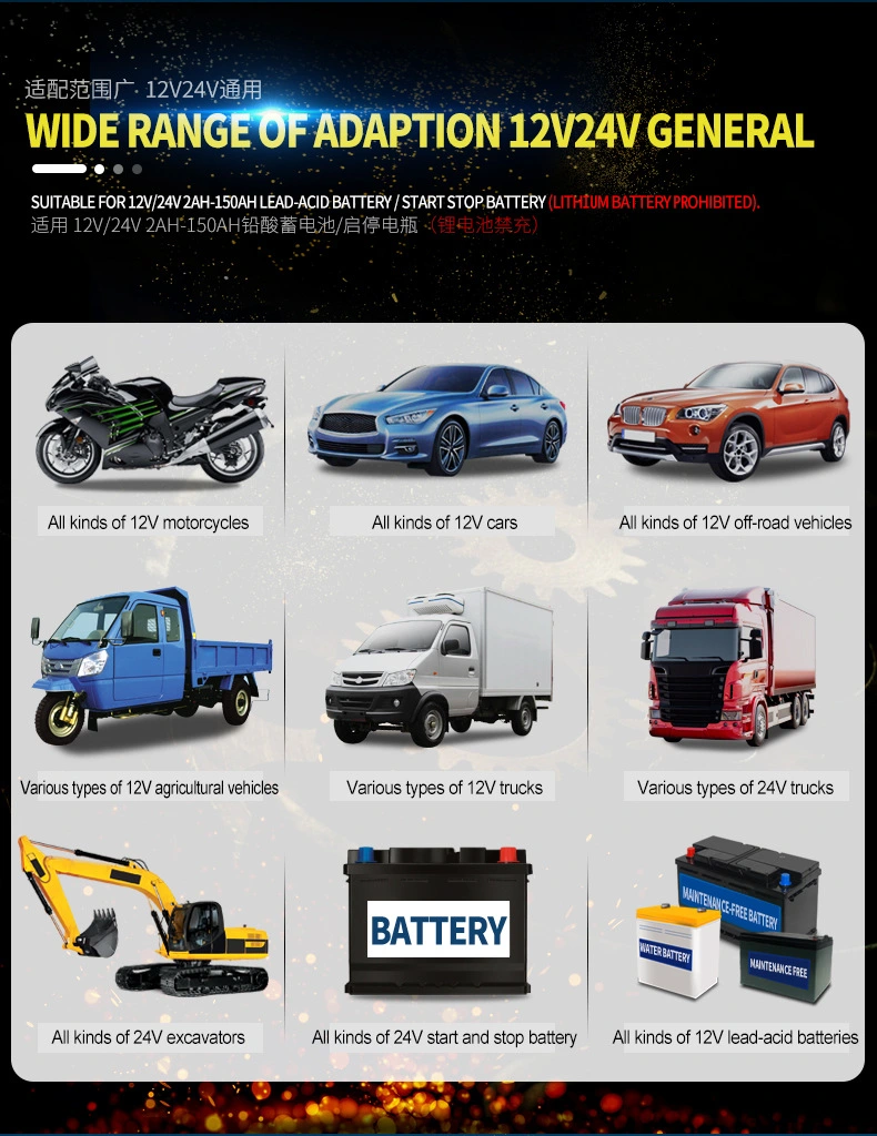A Starwell, a kínai professzionális gyártói beszállító megbízható megoldásaként a J30 intelligens akkumulátortöltő 12V 8A és 24V 4A kettős kimeneti módot integrál, így alkalmas autókhoz, motorkerékpárokhoz, teherautókhoz és tengeri alkalmazásokhoz. Automatikusan azonosítja az akkumulátor állapotát, és optimalizált töltési teljesítményt biztosít az AGM, EFB, GEL és elárasztott akkumulátorok számára, biztosítva a stabil energia-visszaállítást és a meghosszabbított élettartamot.