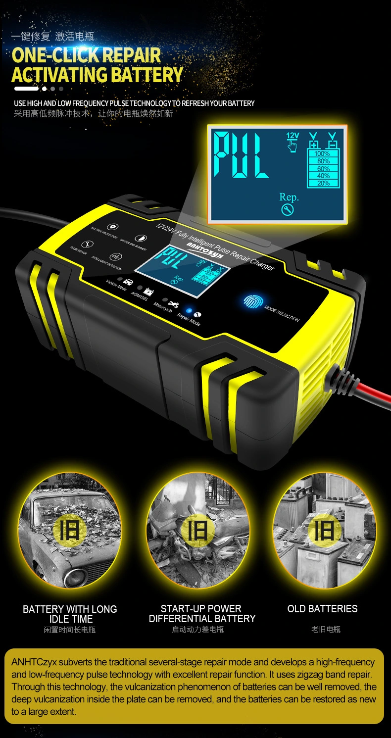 · Impulzusjavító funkció: Nagyfrekvenciás impulzustechnológiát használ az ólom-szulfát kristályosodásának (szulfatációjának) csökkentésére, segítve az elveszett kapacitás helyreállítását az elöregedett vagy alultöltött akkumulátorokban.