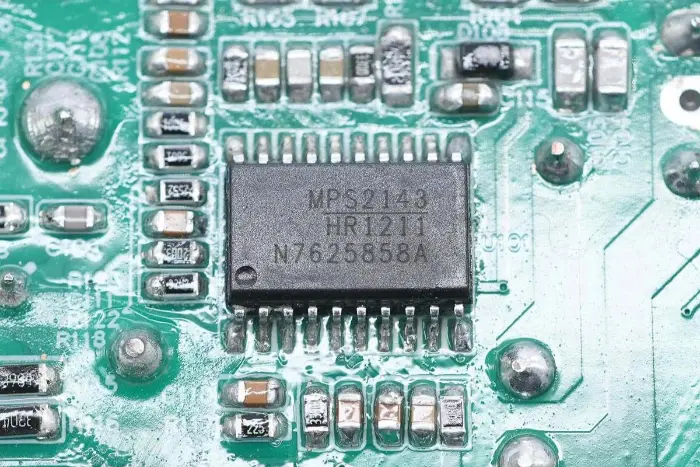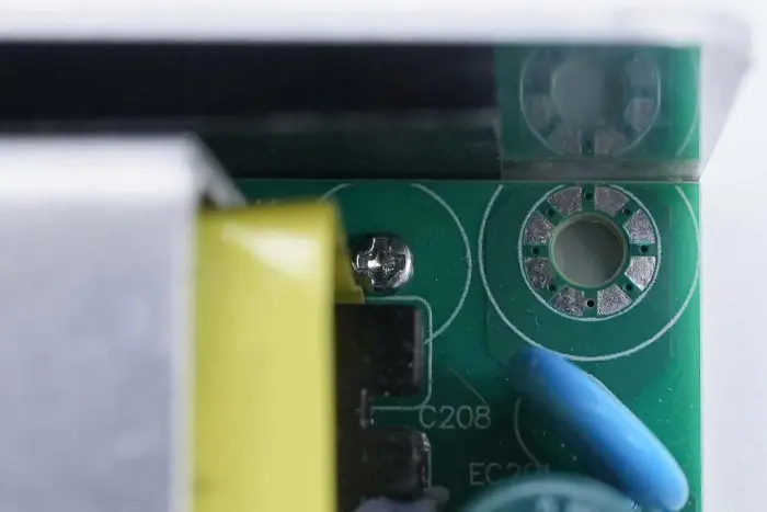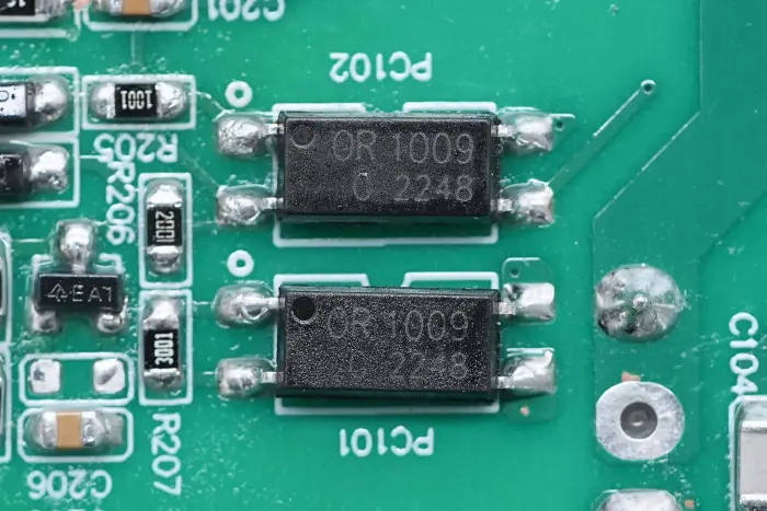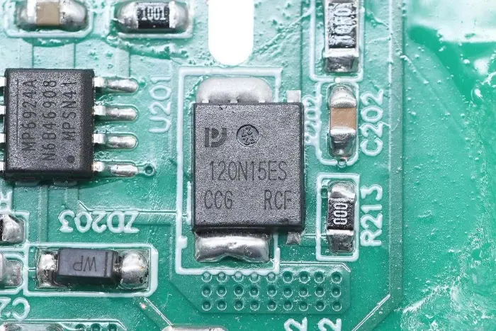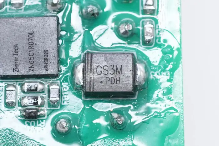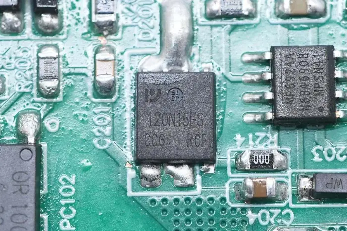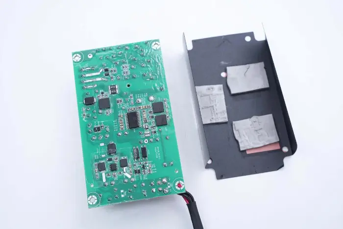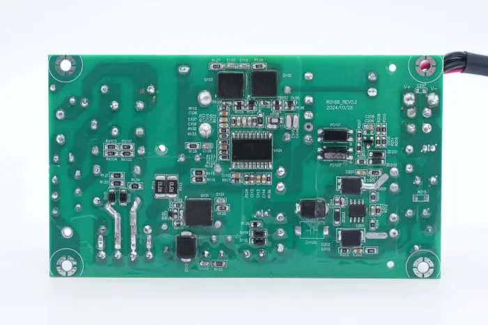 A PCBA modul hátoldalán egy 2 az 1-ben PFC+LLC vezérlő található. A PFC kapcsoló a bal alsó sarokban, az LLC kapcsoló a fő vezérlőchip felett, a visszacsatoló optocsatoló a jobb oldalon, a szinkron egyenirányító vezérlő és két szinkron egyenirányító pedig alul található. Az egész tábla konform bevonattal van bevonva a védelem érdekében.