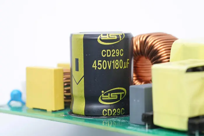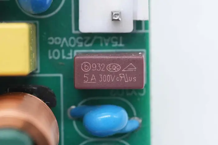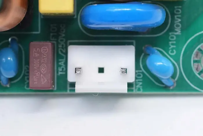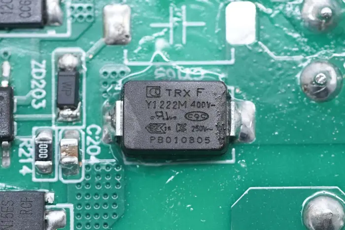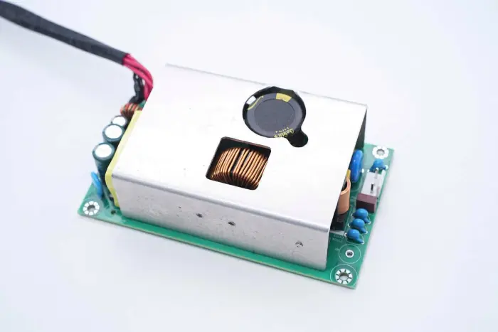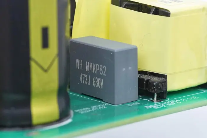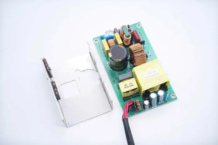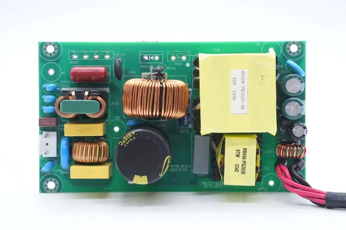 A PCBA modul elülső oldalának áttekintése: a bal oldalon egy táp bemeneti aljzat, biztosíték, Y kondenzátor, varisztor, közös módú induktor és biztonsági X2 kondenzátor található. A középső pozíció PFC boost induktorral és nagyfeszültségű szűrőkondenzátorral van felszerelve. A jobb oldal LLC rezonanciakondenzátorral, rezonancia induktorral, transzformátorral, szűrőkondenzátorral és szűrőinduktorral van felszerelve.