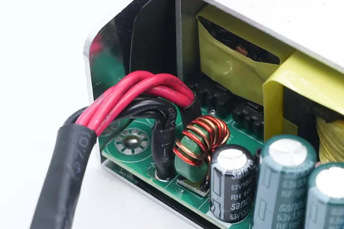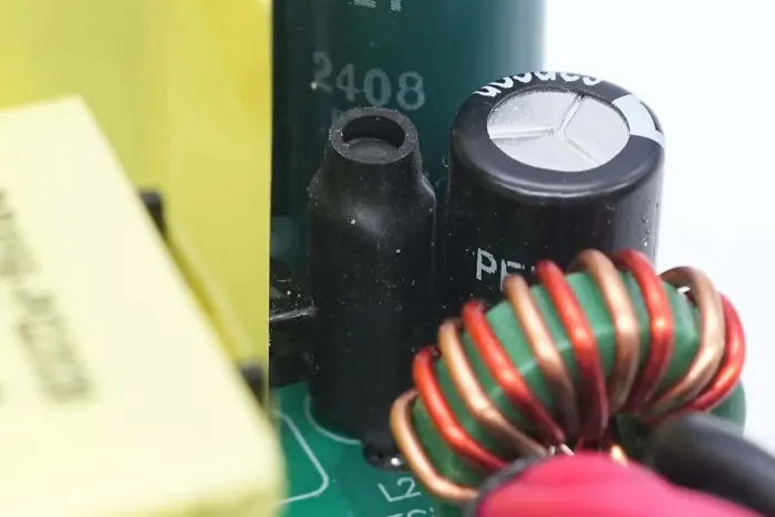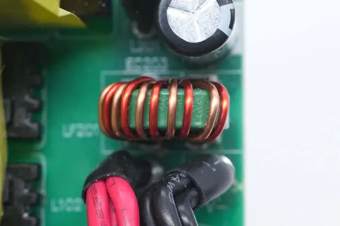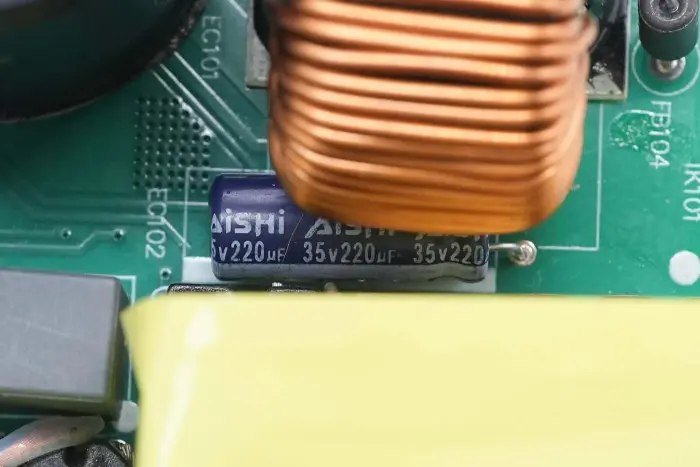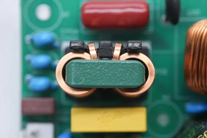 A PFC boost induktor mágnesgyűrűvel van feltekercselve, alul pedig bakelit lemez található a szigeteléshez.