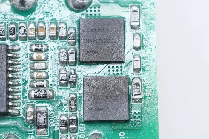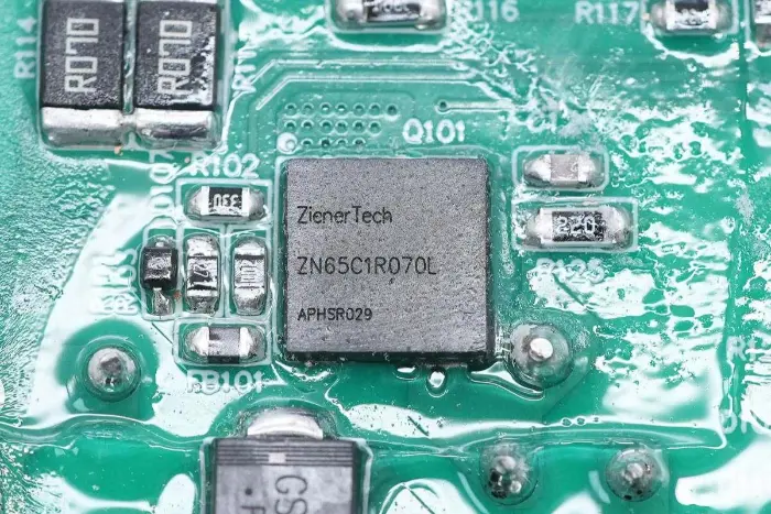 Az LLC kapcsoló a ZenerTech-től származik, ZN65C1R200L modell, Cascode szerkezetű GaN kapcsoló 700 V-os ellenállási feszültséggel és 800 V-os tranziens ellenállási feszültséggel, 200 mΩ bekapcsolási ellenállással, 20 V-os kapumeghajtó feszültség támogatással. Alacsony kaputöltéssel rendelkezik, ami hatékonyan leegyszerűsíti a meghajtó áramkört. Alkalmas gyorstöltőkhöz, kommunikációs tápegységekhez, adatközpontokhoz és világítási alkalmazásokhoz, DFN8*8 csomagban.
