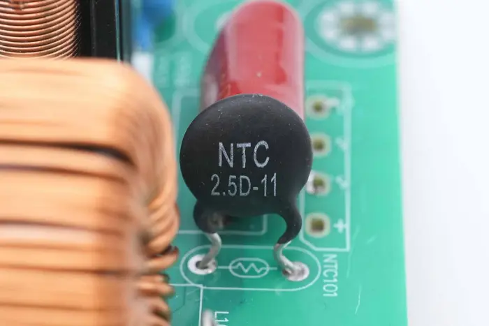 Az NTC termisztor 2.5D-11 jelzésű, a nagyfeszültségű elektrolitkondenzátor töltőáramának elnyomására szolgál.