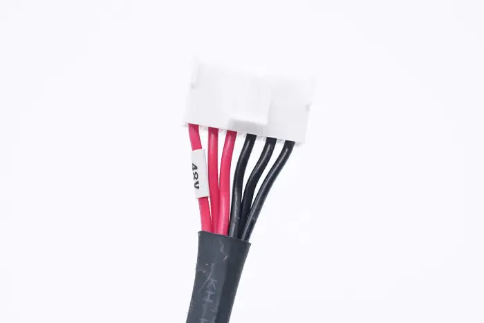Közelkép a kimeneti csatlakozóról: a piros vezeték a pozitív pólus, a hüvelyen pedig 48V kimenetre van jelölve.