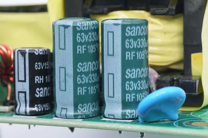 A kimeneti szűrőkondenzátorok a Sancon (Nantong Sanxin) RF sorozatú hosszú élettartamú kondenzátorai, 63V 330μF specifikációval, kettő párhuzamosan.