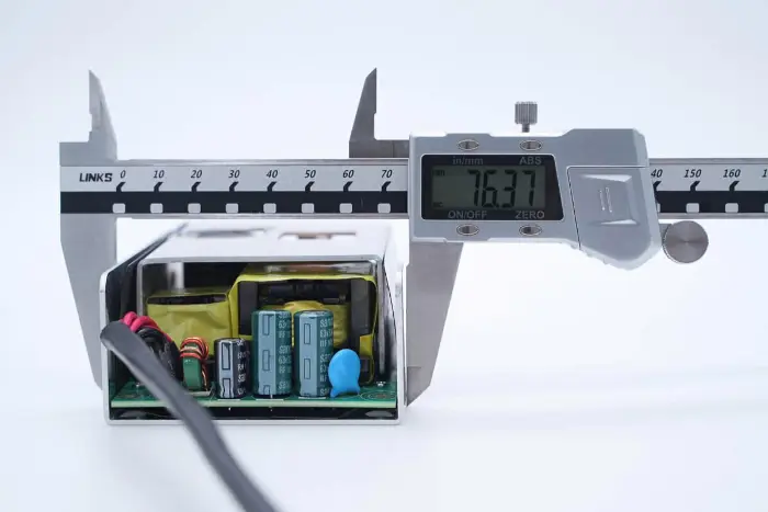 A tápegység modul szélessége körülbelül 76,4 mm.